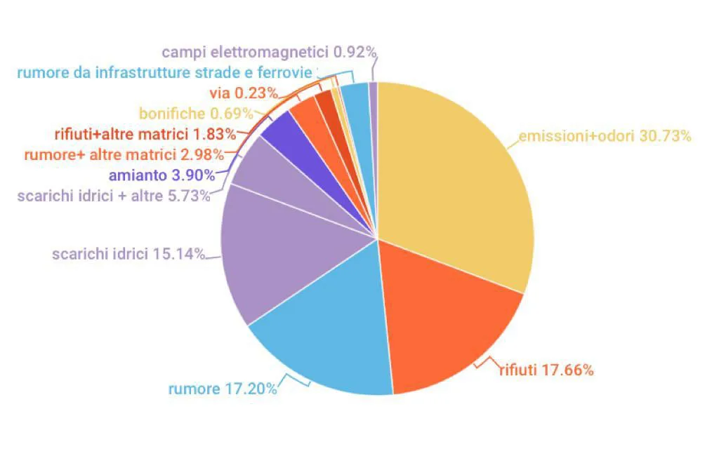 Le problematiche segnalate con più frequenza sono relative alle emissioni in atmosfera (40), provenienti in misura maggiore dalla zona del cuoio (22), e alle maleodoranze (37) per lo più derivanti da una attività di allevamento di bovini nel comune di Pontedera. Altre segnalazioni sono relative agli scarichi idrici (28) e al rumore proveniente da locali o attività produttive (35). Numerose anche le segnalazioni che riguardano i rifiuti ed alcune segnalazioni per l’amianto abbandonato o per manufatti in cattivo stato di manutenzione.