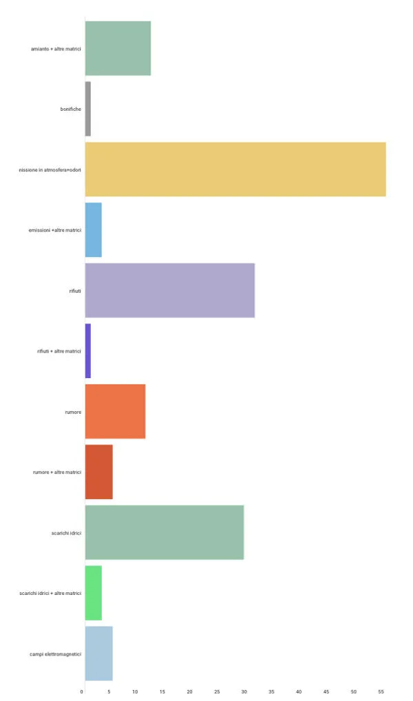 Per quanto riguarda le matrici contenute nelle segnalazioni dei cittadini, possiamo dire che la problematica maggiormente segnalata dalla cittadinanza, anche in questa parte di Toscana, è l’inquinamento atmosferico, in particolare le emissioni in atmosfera con o senza odori (55), seguite da problemi connessi alla gestione dei rifiuti (32) e agli scarichi idrici (32) .
