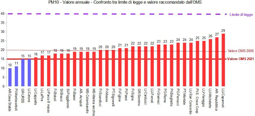 Rispetto all’attuale normativa europea, in base alla quale tutte le stazioni di rete regionale rispettano il valore limite annuale per il PM10, solo 4 stazioni (12%) rispetterebbe già il nuovo valore guida indicato dall’OMS.