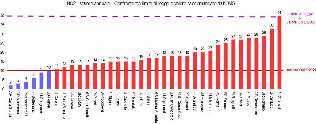 Per il biossido di azoto il valore limite annuale di 40 µg/m³ non è rispettato esclusivamente nella stazione di traffico di FI-Gramsci, mentre il valore guida di 10 µg/m³ sarebbe rispettato solo da 6 stazioni su 36 (17%).