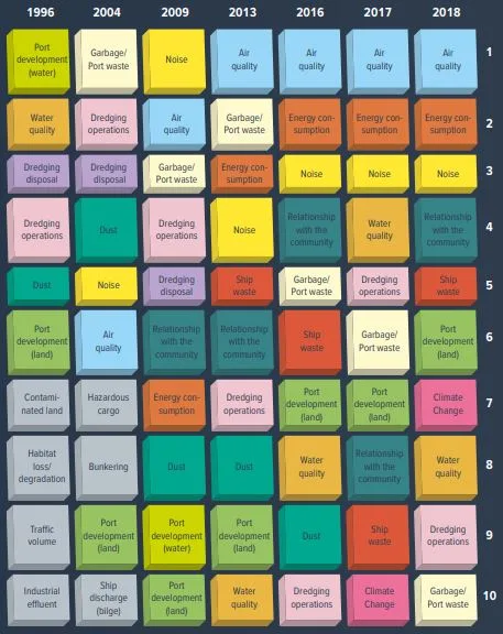 Gli stessi soggetti gestori dei porti europei percepiscono tali preoccupazioni ed in particolare l’inquinamento dell’aria, l’efficienza energetica e le emissioni sonore sono dal 2016 le prime tre priorità ambientali secondo il rapporto annuale di ESPO-European Sea port Organisation realizzato intervistando 90 porti, membri di ESPO, in 19 diversi paesi (vedi immagine a fianco).
