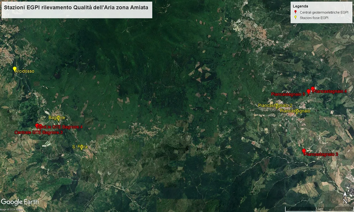 Tali indicatori sono stati desunti dai dati validati ottenuti dalle stazioni della rete di rilevamento di ENEL Green Power Italia (EGPI), localizzate in: Arcidosso (ARDO), Santa Fiora (SAFI), Loc. Bagnore (BAGN), Loc. Merigar (MERI) e Piancastagnaio (PICA, PICA2). In Località Bagnoli (Arcidosso), dall’8/05/2013 al 26/09/2018 è stata inoltre collocata una stazione mobile ARPAT (GEO1).