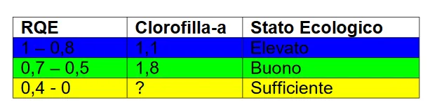 Sebbene ciascun parametro sia in grado di fornire informazioni sullo stato ecologico delle acque, la classificazione dei corpi idrici viene effettuata soltanto in base ai valori di clorofilla-a. Tali valori servono a definire il Rapporto di Qualità Ecologica (RQE), un parametro compreso fra 0 e 1 e suddiviso in 3 classi, che corrispondono ad altrettante classi di Stato Ecologico – Buono, Sufficiente, Scarso – secondo il D.M. 260/2010. I limiti di classe dei valori di RQE sono riportati in tabella 1.e sono quelli indicati per i corpi idrici del macrotipo 3, a cui appartiene la totalità delle acque costiere toscane,
