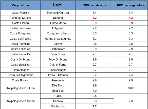 I valori dell‘indice trofico per le regioni marino costiere della Toscana indicano, per il 2019, una condizione di oligotrofia caratterizzata, in generale, da alti tassi di ossigeno e basse concentrazioni di nutrienti, spesso pari al limite di quantificazione strumentale. Dall’analisi dei dati si individua però una zona maggiormente caratterizzata da fenomeni di eutrofizzazione, o comunque soggetta a maggiori scostamenti di trofia: tali stazioni sono caratterizzate da valori medi di TRIX prossimi a 4 (il valore indicato dalla normativa come limite tra classe Buono e Sufficiente, per il macrotipo 3 “Bassa stabilità”). Come si nota dalla tabella seguente i valori medi annuali dell’indice trofico TRIX superano il valore soglia nel corpo idrico Costa del Serchio (Nettuno), declassandone il giudizio di qualità ecologica, mentre in tutti gli altri casi il valore risulta sempre inferiore a 4.