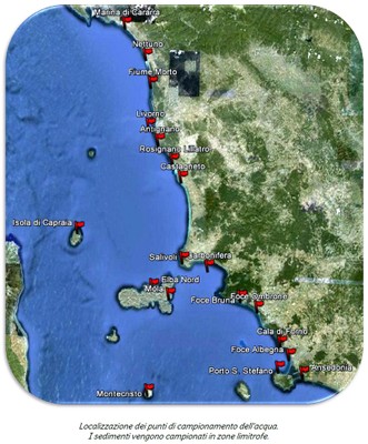 La rete di monitoraggio marino-costiera è costituita da 19 punti di campionamento. I campioni di acqua vengono presi ad una distanza di circa 500/1000 metri dalla riva con cadenza bimestrale. I campioni di sedimenti con cadenza semestrale.
